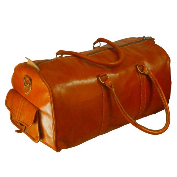 Moroccan leather travel bag, stylish men's travel bag in genuine Marrakech leather with interior lining and two side pockets.